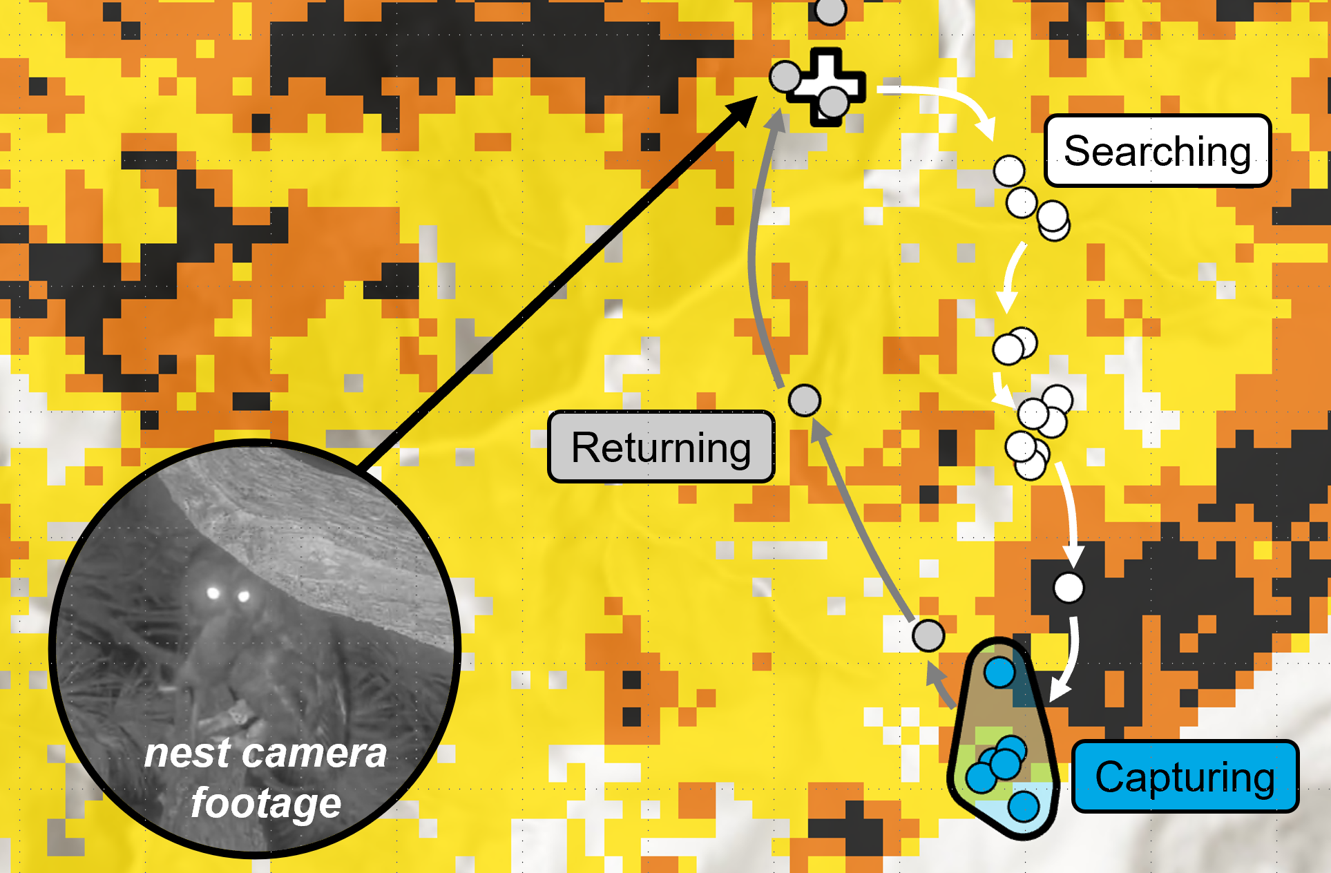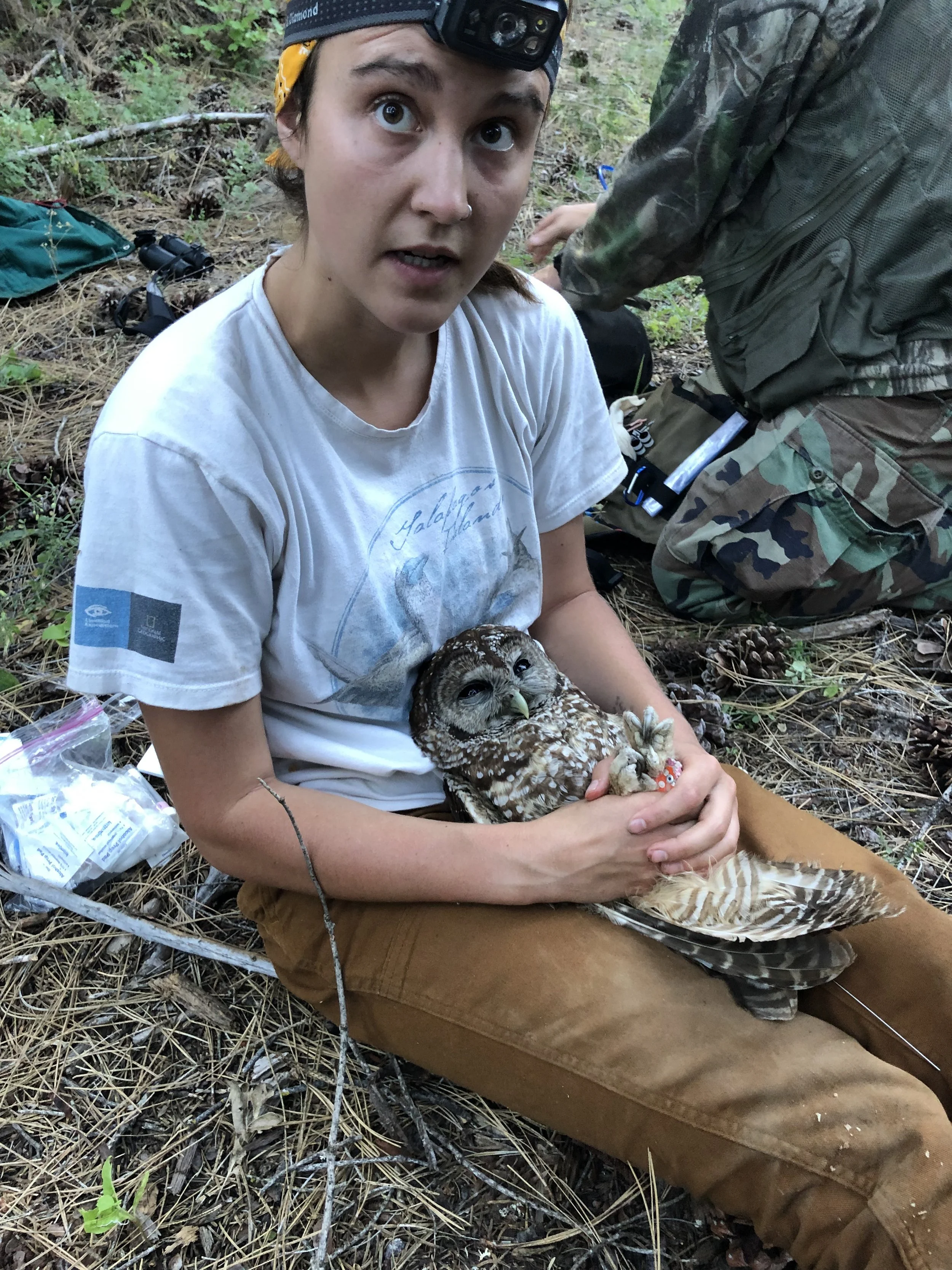 Spotted owls are much larger than flammulated owls, so they require more food to survive. This means their home ranges are much larger. Because spotted owls are larger than flammulated owls, we can attach larger GPS units to them. We can often obtain more data using larger GPS units. By programming GPS tracking devices to record more locations over a shorter period of time, we can get clear movement paths to and from nests. This helps us predict exactly where individuals catch their prey! By combining these fine-scale GPS locations and simultaneous nest camera monitoring, we can understand exactly what habitat spotted owls need for foraging and what exactly they are foraging for!