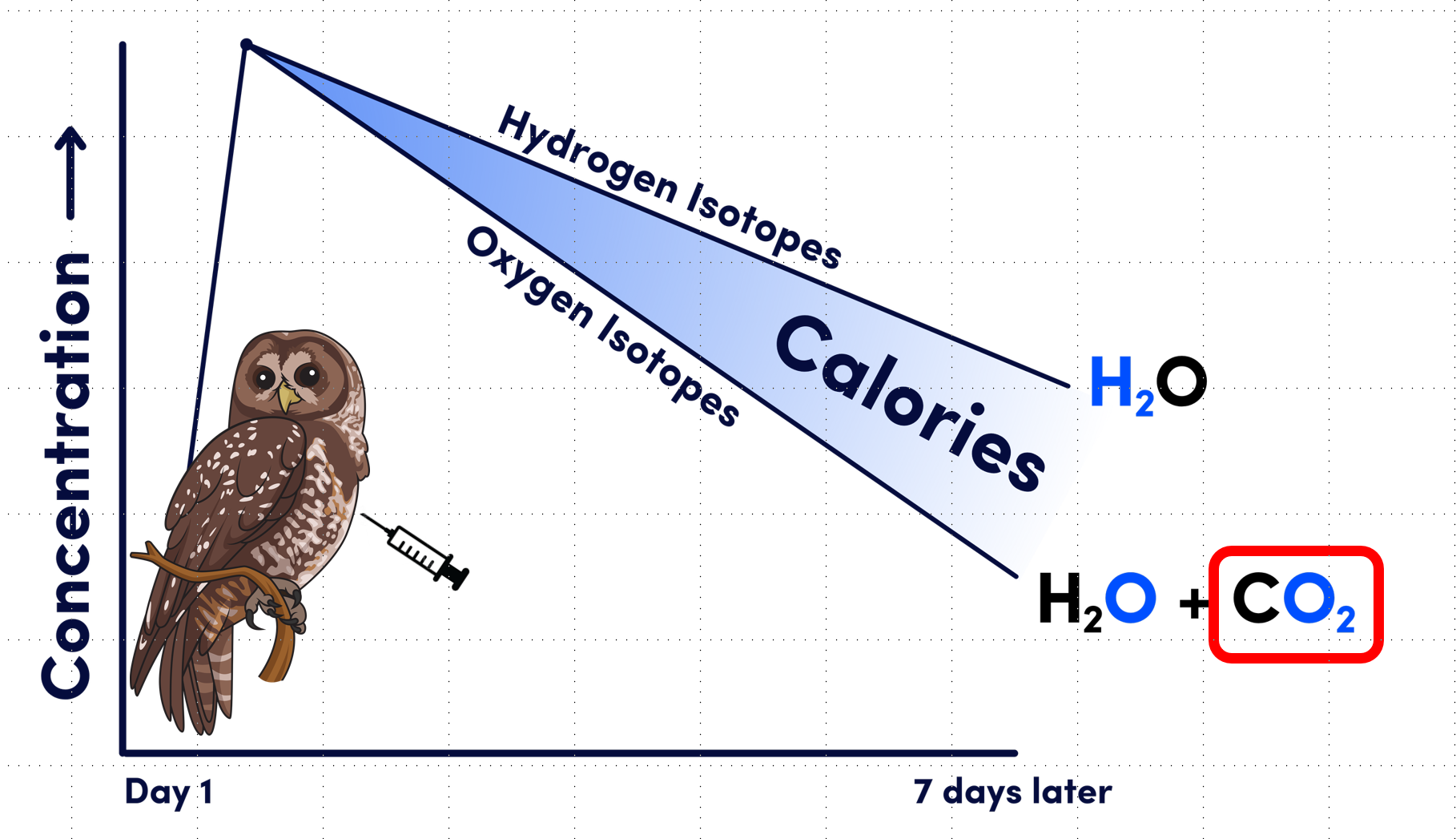 We can calculate a field metabolic rate using a technique called “doubly labeled water.” This involves capturing free ranging animals and injecting them with saline and a very specific concentration of deuterium and oxygen-18, which are heavy isotopes of hydrogen and oxygen. Animals are released and are free to move about their ecosystem as normally as possible. After a few days, individuals are recaptured and a blood sample is obtained. In the lab, we take all of the water out of the blood and measure the remaining concentration of oxygen and hydrogen isotopes. The difference in the rate of hydrogen elimination and oxygen elimination is equivalent to the rate of carbon dioxide elimination—which we can use to estimate the amount of energy an individual spent while moving around its wild system!