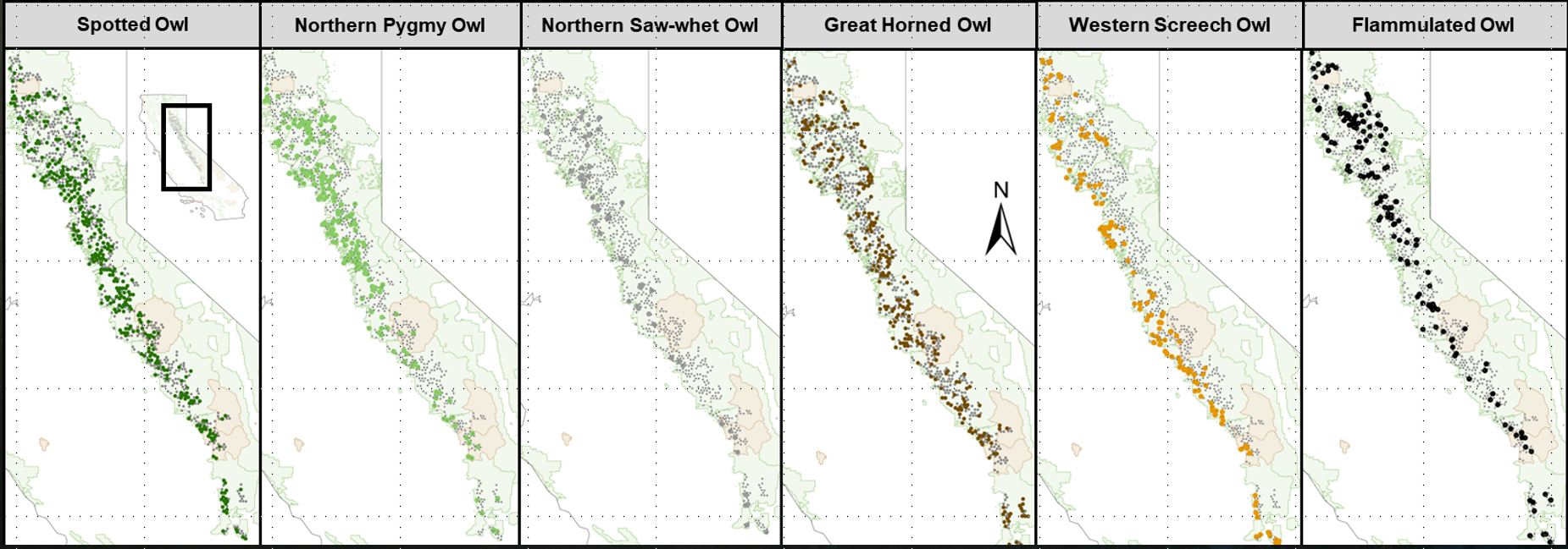 We can combine all of the acoustic data from thousands of ARUs deployed across a region to start to understand how, for example, wildfires impact flammulated owls (as well as any other species that vocalizes). Below are locations where different owl species were detected across the Sierra Nevada!