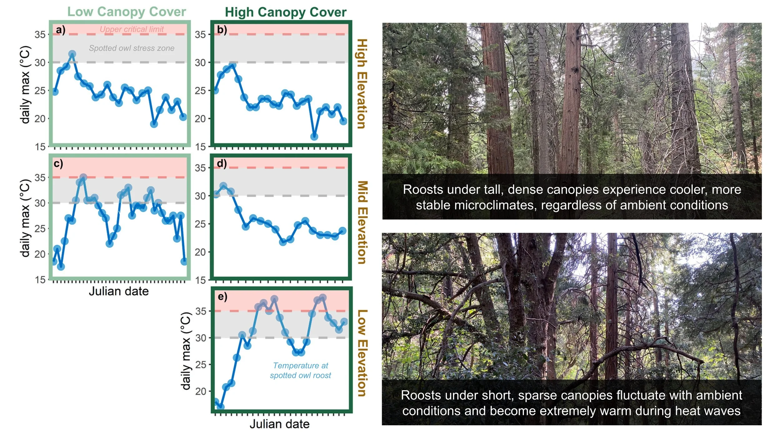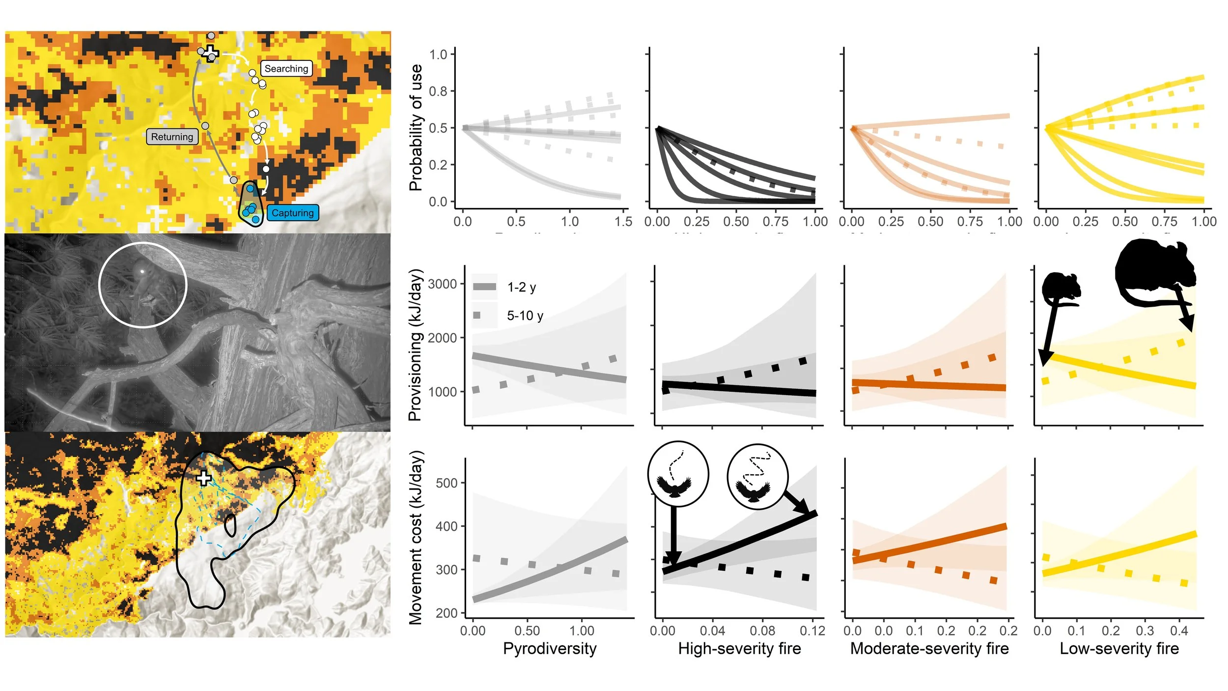 Temperatures are rising globally and heat waves are becoming more frequent and extreme. These changes will likely have both direct and indirect effects on free-ranging wildlife. Forest animals can sometimes avoid the negative physiological consequences of heat waves by resting in stable microclimates created by tall trees and closed canopies. However, these structures are threatened by changing disturbance regimes (including predominantly high-severity wildfires and more extreme drought-and insect-related tree mortality). As climate events become more extreme and climate refugia become more sparse, the indirect effects of climate change may exacerbate the direct effects of climate change on vulnerable organisms. We use a combination of GPS-tracking, physiological investigations, and demography to quantify the effects of changing climatic conditions—including changing disturbance regimes—on individuals, populations, and communities.