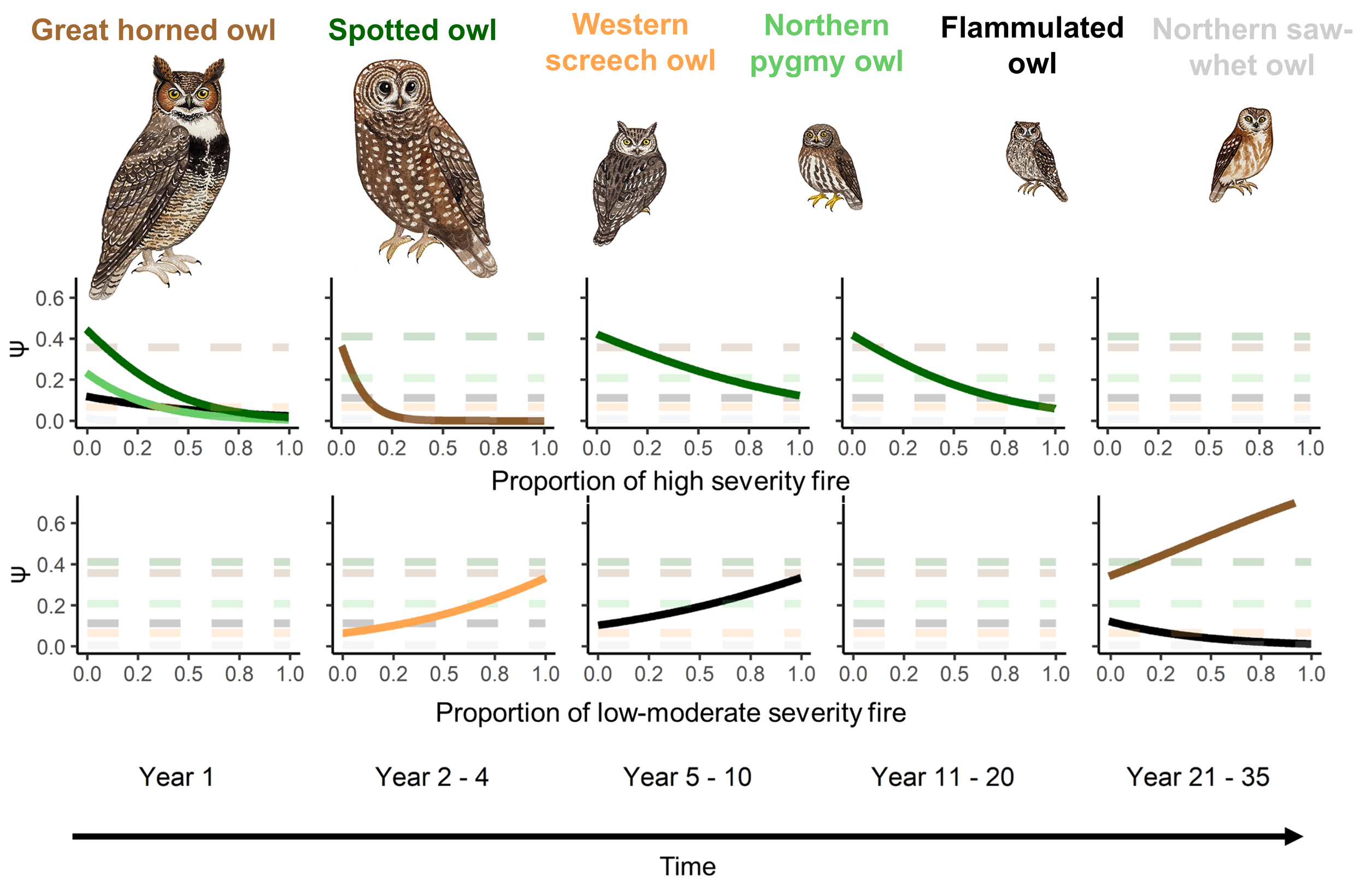 Wildfire has been a fundamental component of natural ecosystem dynamics for millennia. However, climate change, fire suppression, and Colonial land use have produced larger, more severe, and/or more frequent fires that threaten a range of wildlife species. We use a variety of strategies, including species distribution modeling, bioacoustics, demography, GPS-tagging, and physiological experiments to better understand the impact of fire on individuals, populations, species, and communities. (all owl art by Kate Dolamore)